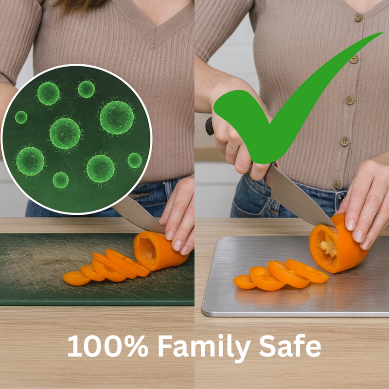 Every cut on a plastic or wooden chopping board leaves tiny grooves that trap bacteria and germs — invisible dangers that can contaminate your food every time you cut food.